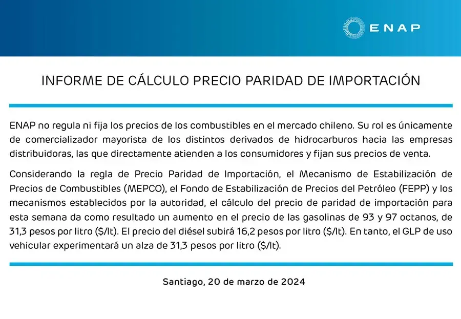 El pasado miércoles 20 de marzo la Empresa Nacional del Petróleo (ENAP) informó una importante alza en el precio de los combustibles, alcanzando los $31,3 en bencina y GLP, además de $16,2 en diésel-petróleo.