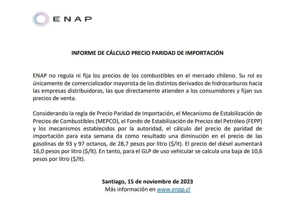 Revisa a continuación el informe semanal de precios de los combustibles de ENAP del miércoles 15 de noviembre.