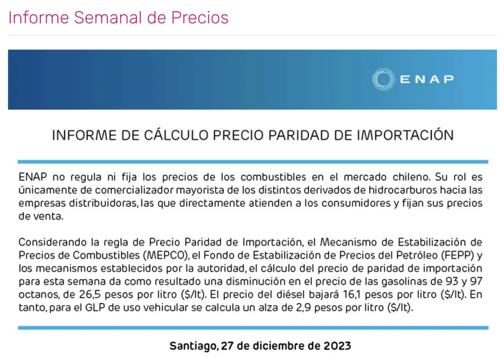 La Empresa Nacional del Petróleo (ENAP) publicó este miércoles 27 de diciembre su Informe de Semanal de Precios, en el que se informaron los nuevos valores que tendrá la bencina y los demás combustibles en el país desde este jueves.