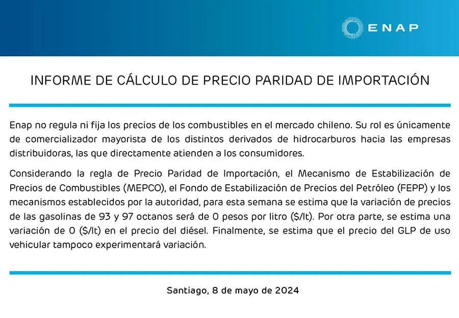 Según informó ENAP en su Informe de Precios de los Combustibles de este miércoles 8 de mayo, esta semana no habrá variaciones en ninguno de los combustibles, debido a que actualmente el valor de la bencina, del diésel y del GLP varía cada tres semanas y no una, gracias al Mecanismo de Estabilización de Precios de los Combustibles (MEPCO).