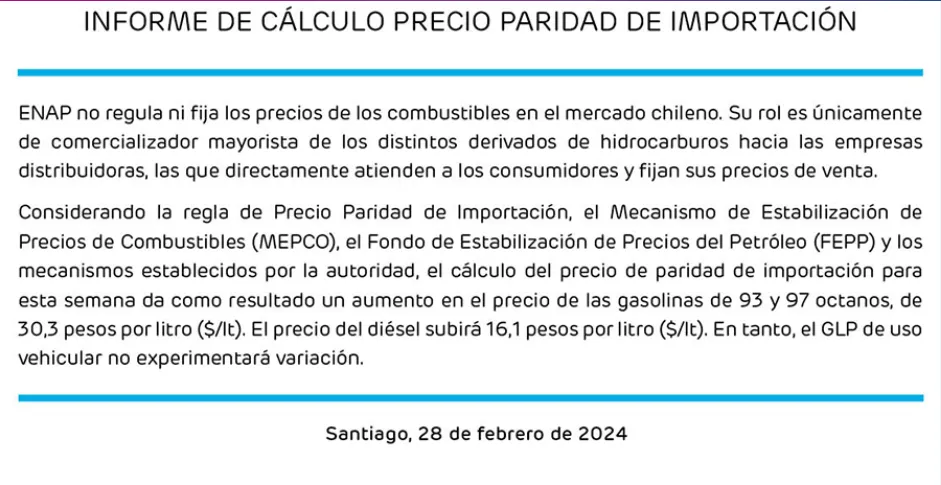 De acuerdo a lo indicado por la Empresa Nacional del Petróleo en su Informe semanal, desde este jueves 29 de febrero habrá un alza de $30,3 por litro en el precio de la bencina de 93 y 97 octanos respectivamente.