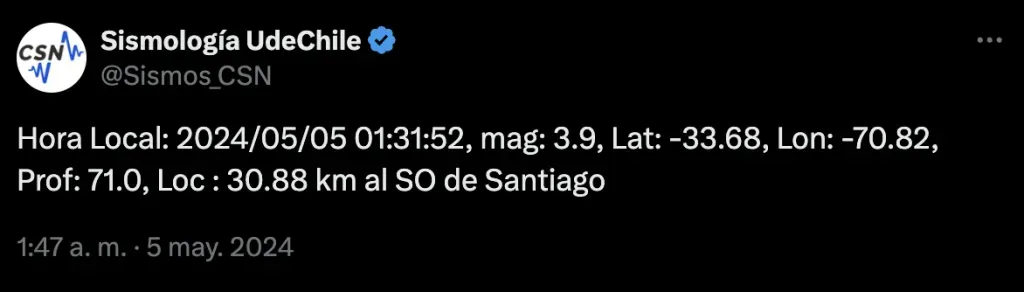 Hace días que no se reportaba un sismo de esta magnitud en las cercanías de la Región Metropolitana, pero esta madrugada de 5 de mayo se sintió un importante temblor en la zona centro de Chile.