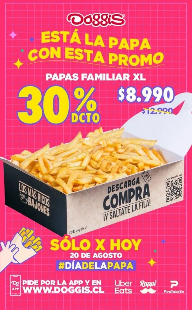 Doggis informa a través de su cuenta de Instagram, que la promoción en el Día de las Papas Fritas será un 30% en las papas familiares XL a $8.990.