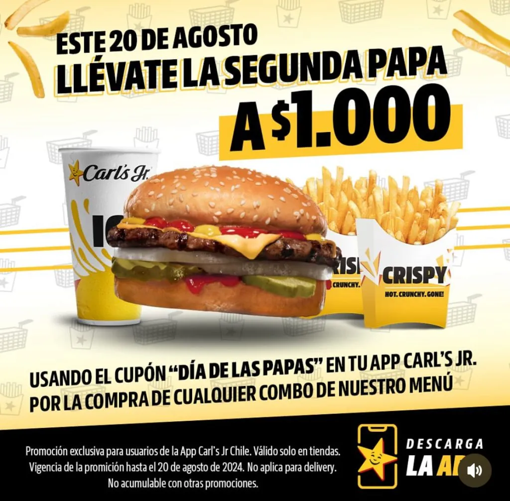 La cadena de comida rápida también tendrá una promoción de papas fritas, esto usando un cupón de descuento en la app de Carl’s JR Chile.