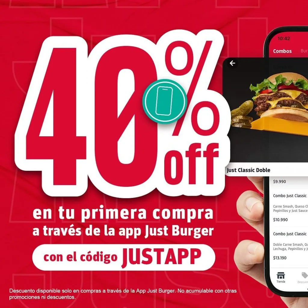 Además de estas exquisitas ofertas, Just Burger ofrece promociones y descuentos tentadores todos los días de la semana, incluyendo un 40% de descuento en tu primera compra al descargar la App de Just Burger Chile (no acumulable con descuentos ni promociones).