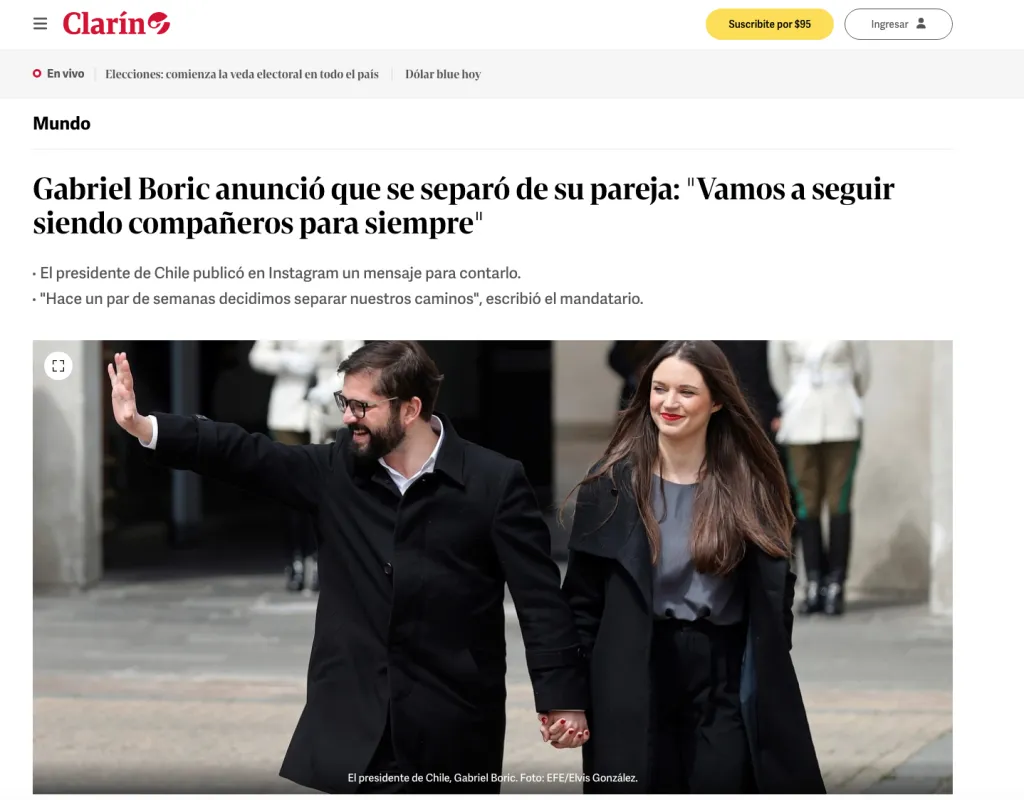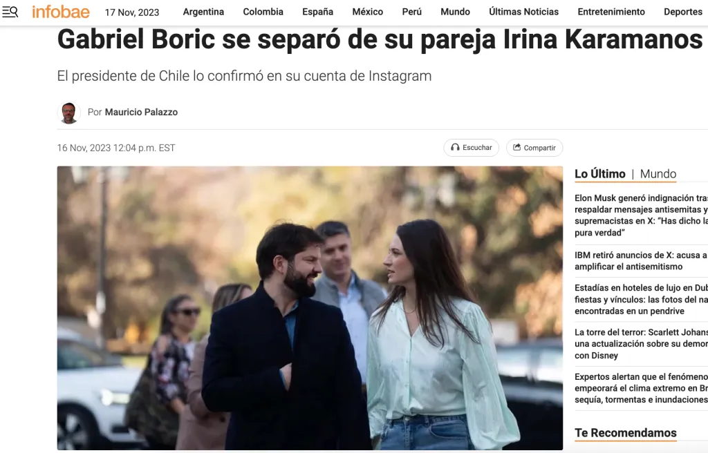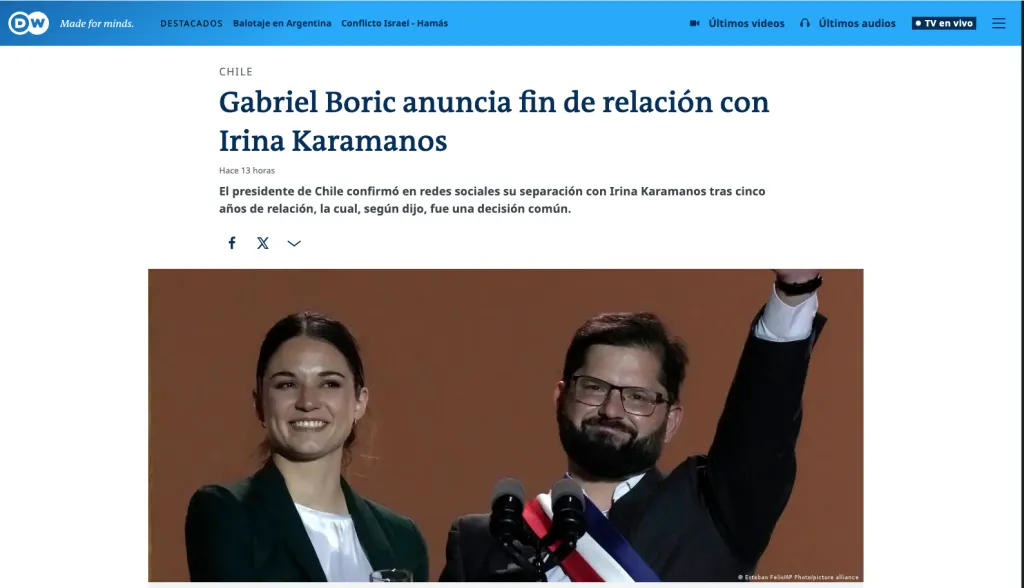 “Gabriel Boric se separó de su pareja Irina Karamanos”, de esta forma titulaba la noticia el portal de noticias Infobae. Cabe mencionar que este medio también señaló los indicios que evidenciaban la ruptura amorosa entre el jefe de Estado y Karamanos.