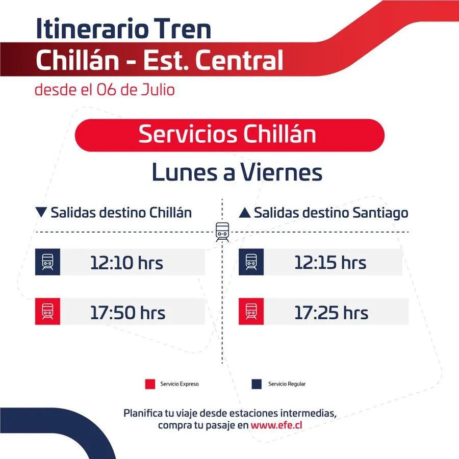 Otro servicio que regresó en los últimos días fue el servicio Santiago-Chillán, el cual regresó el pasado viernes 5 de julio, también con horarios especiales de solamente dos viajes diarios ida y regreso (Uno regular y otro expreso).