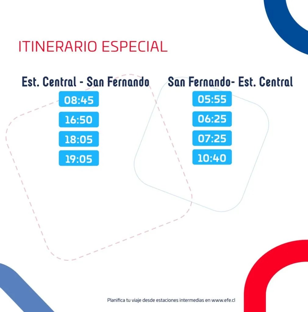 Adicionalmente, Ferrocarriles anunció que se ha reanudado el servicio Santiago-San Fernando con ocho frecuencias diarias de lunes a viernes desde las 5:55 AM horas (Salida desde San Fernando) hasta las 19:05 horas (Salida desde Santiago).
