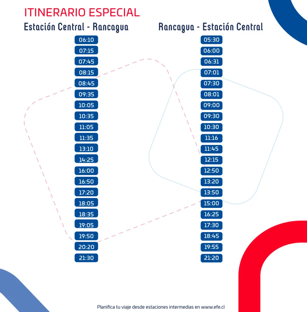 Una importante novedad anunció la Empresa de Ferrocarriles del Estado (EFE), se trata de los nuevos horarios del servicio de pasajeros que conecta Santiago con Rancagua, el cual aumentará su frecuencia en hasta 42 servicios diarios los días de semana y 29 durante los fines de semana.