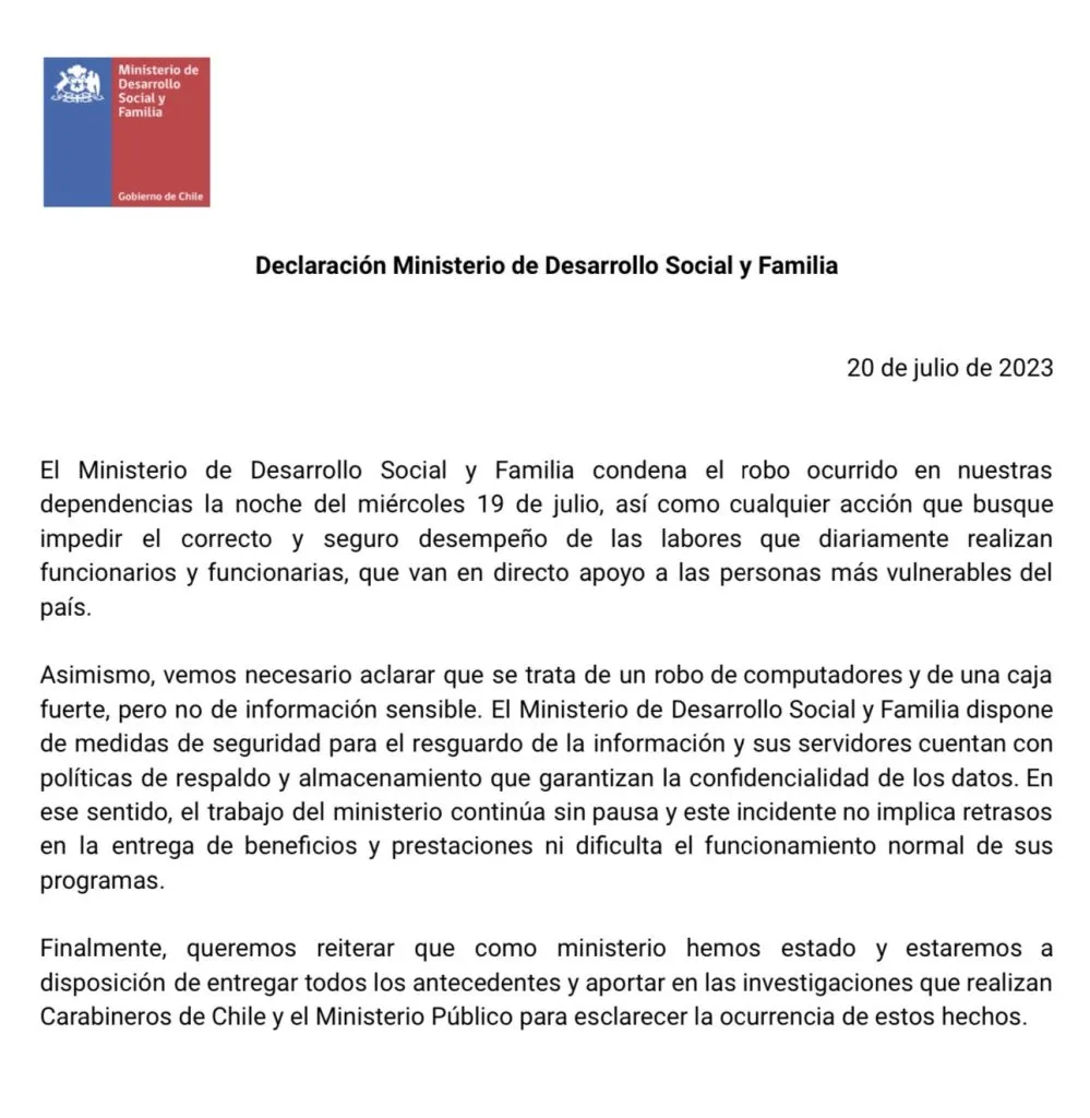 Mediante un comunicado, la cartera de Desarrollo Social condenó “el robo ocurrido en nuestras dependencias (…), así como cualquier acción que busque impedir el correcto y seguro desempeño de las labores que diariamente realizan funcionarios y funcionarias, que van en directo apoyo a las personas más vulnerables del país”.