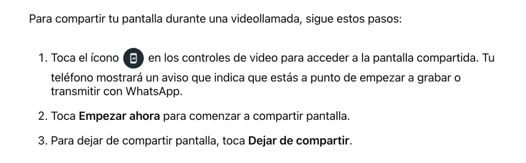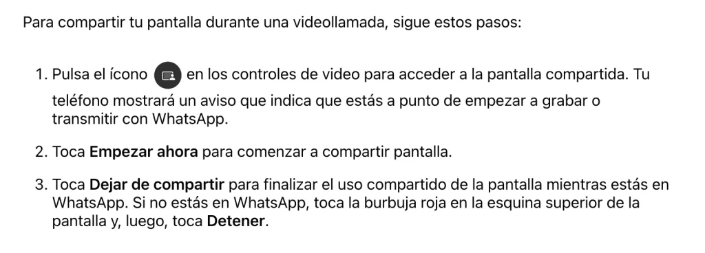 - La pantalla compartida está protegida con cifrado de extremo a extremo y nunca se graba en WhatsApp. Nadie fuera de la llamada, ni siquiera WhatsApp, puede ver u oír lo que compartes en tu pantalla.