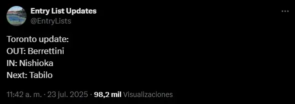 La situación es curiosa. Hasta hace poco, Tabilo tenía descartado Toronto como parte de su regreso tras la lesión que lo dejó fuera de Wimbledon.