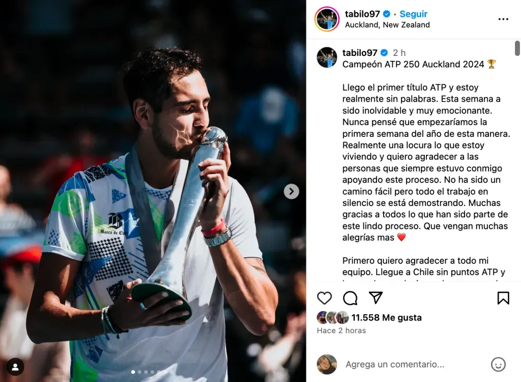 En sus redes sociales detalló aún más lo que sintió este viernes al ganar el ATP 250 de Auckland 2024. “Llegó el primer título ATP y estoy realmente sin palabras. Esta semana ha sido inolvidable y muy emocionante. Nunca pensé que empezaríamos la primera semana del año de esta manera”, comentó.