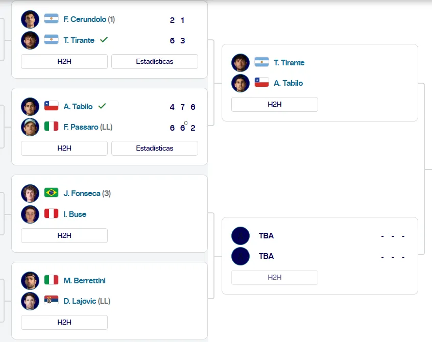 El vencedor del duelo entre Alejandro Tabilo y Thiago Tirante avanzará a las semifinales del ATP 500 de Río de Janeiro, donde se medirá al ganador de una llave que recién se conocerá este jueves, cuando se disputen dos encuentros de octavos; primero Joao Fonseca (38°) vs. Ignacio Buse (91°) y también Matteo Berrettini (57°) vs. Dusan Lajovic (129°).