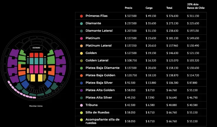 En cuanto a los precios, aún no se informa cuánto saldrá cada entrada. Pero sí que eEl descuento con Banco de Chile será de un 20% del valor original y que podrás comprar con 3, 9 o hasta 12 cuotas con tu tarjeta. Además, podrás comprar hasta el 25% del valor total con tus dólares premio del banco.