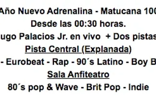 Qué:Recibe este año 2020 de la mejor manera junto a la increíble fiesta de año nuevoAMANDAZO! Ven a vivir una noche de lujo con3 exclusivos ambientes,bar abierto, una atención de primer nivel y la mejor música del momento.BAR ABIERTO TODA LA NOCHE EN: Ballantines Finest, Abosolut Blue, Pisco Mistral 35°, Gin Beefeater, espumante, Cerveza Heineken, jugos y bebidas.Apertura desde la 01:30 horas Fiesta hasta las 07:00 horas.