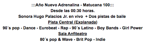 Qué:Te invitamos a recibir este 2020 en el1º año nuevo sustentable de Chile. No dejes de asistir a un evento que será irrepetible.Bar Abierto ILIMITADO en sector VIP, TODA LA NOCHE, Main Stage Ultrabailable, Sector Eco Lounge Electrónico, más de 1000 m2 de Terrazas,Capacidad LIMITADA, Salón Ultrabailable. El line up contempla la participación deFrancon Recabarren, Franco el Gorila y Ceaese.