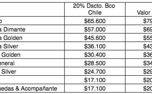 Habrá unapreventa exclusiva para clientes delBanco de Chile que paguen con sus tarjetas en 3, 9 ó 12 cuotas sin interés, accediendo a un descuento del 20%, hasta agotar stock de 7 mil tickets, desde el lunes 20 de enero al mediodía. Eso sí, hayun máximo de 6 tickets por transacción.