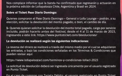 En cuanto a la devolución de entradas, el sitio oficial informó que “quienes compraron el Pase Diario Domingo – General o Lolla Lounge – podrán, a su elección, solicitar el total de la devolución del monto pagado; o bien, el cambio de día, desde el 4 al 11 de marzo de 2023 en Puntoticket”.