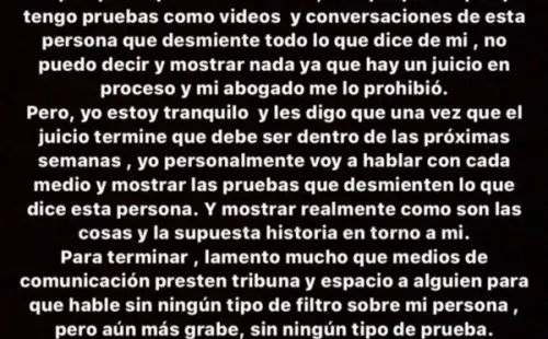 Aún así, luego advierte que “yo estoy tranquilo y les digo que una vez que el juicio termine que debe ser dentro de las próximas semanas, yo personalmente voy a hablar con cada medio y mostrar las pruebas que desmienten lo que dice esta persona. Y mostrar realmente cómo son las cosas y la supuesta historia en torno a mi“.