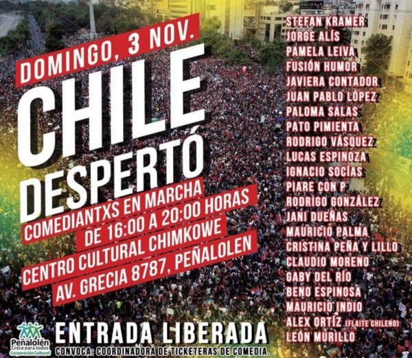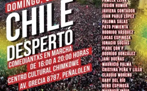 A propósito del estallido social, un amplio grupo de comediantes anunció que se unirán para concretar el acto humorístico-social “Chile Despertó”,en el que “los comediantes chilenos pretenden aportar desde su gremio a la construcción de un Chile más justo, equitativo y digno“.