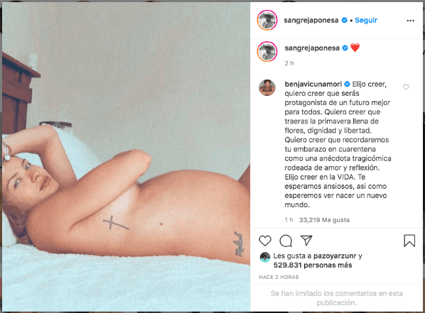 La información se rumoreaba hace días, pero ahora los mismos protagonistas de la historia salieron a zanjar el tema: la argentina publicó una imagen en la que aparece con el vientre evidentemente abultado y mirada coqueta, ante lo que el chileno reaccionó con un extenso y esperanzador mensaje.