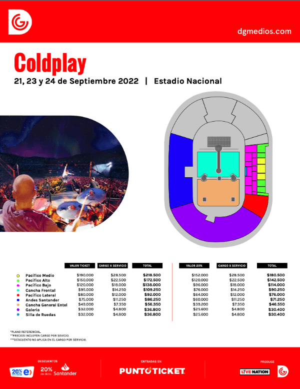 Mientras que el inicio de la venta general partirá dos días después, el miércoles 13 a las 11:00 horas, con valores entre los $36.800 y los 218.500.