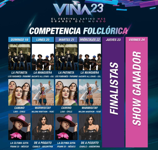 En lo que respecta a la competencia folclórica del Festival de Viña del Mar 2023, la programación de los distintos artistas se distribuyó de la siguiente manera: