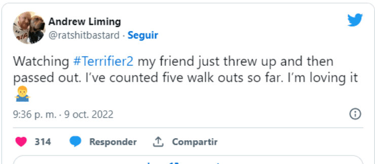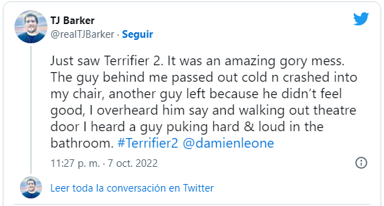 Terrifier llegó a los cines de Estados Unidos el pasado 6 de octubre y provocó un gran impacto en sus espectadores, en donde algunos asistentes sufrieron desmayos, vómitos y mareos debido a las fuertes y gráficas escenas que contiene la película gore.