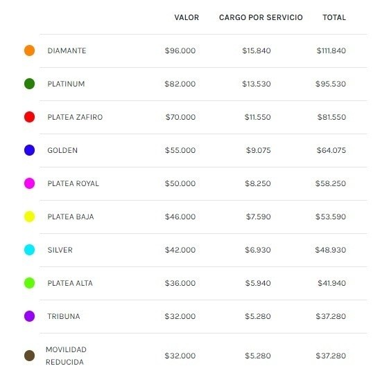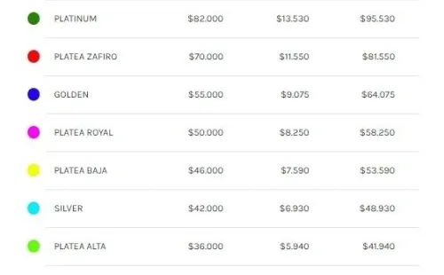 La entrada más económica es Tribuna, con un valor agregado de $37.280, y el tícket más costoso es Diamante, el cual tiene un precio de $118.840.