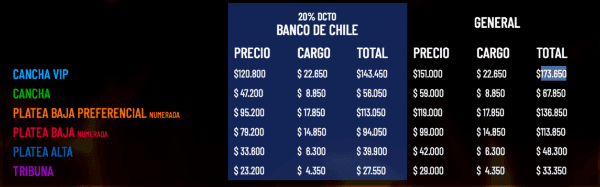 La venta general partiráel19 de diciembre, tambiéna las 11:00 horas, siempre en el sistemaPunto Ticket, con valores entre los33.350 y los173.650 pesos.