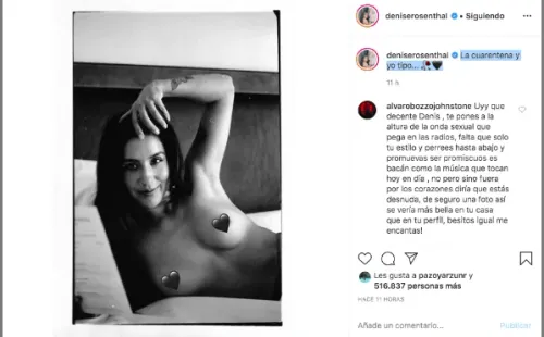 “La cuarentena y yo tipo… ����”, comentó Rosenthal junto a la sugerente imagen en la que apenas aparece cubierta por dos emoticones de corazón.