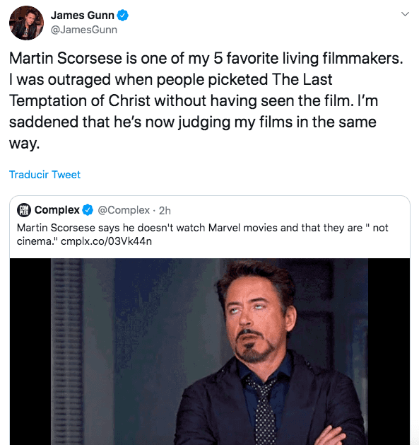 Tarde o temprano iba a suceder. Alguien del mismísimo Universo Cinematográfico de Marvel tenía que reaccionar ante las críticas que Martin Scorsese lanzó sobre las populares películas con superhéroes. Y uno de los primeros en salir al paso fue el siempre polémico director de “Guardianes de la Galaxia”, James Gunn.