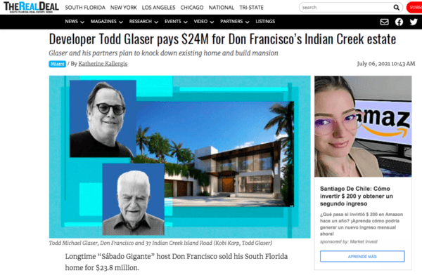 Mario Kreutzberger, Don Francisco, vendió la exclusiva mansión que tenía en la isla Indian Creek Village, en Miami Beach (EE.UU.), por casi 24 millones de dólares.
