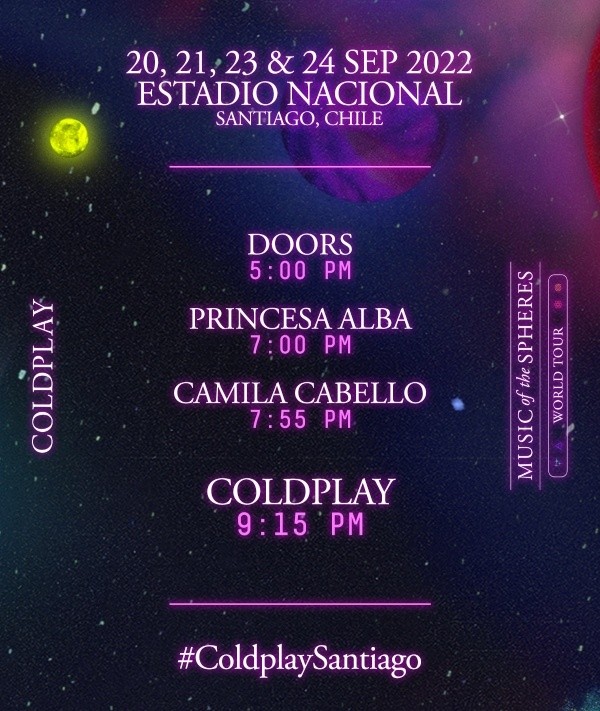 Este miércoleses el concierto de Coldplay en Chile, el segundo de los cuatroque habrá en nuestro país. Los próximos serán el viernes 23 y el sábado 24 de septiembre, en el mismo recinto.
