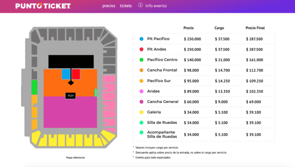 Los valores de las entradas van desde los $39.100 hasta los $287.500, aunque quienes sean clientes de Entel o paguen con tarjetas Scotiabank, podrán acceder a un 20% de descuento.
