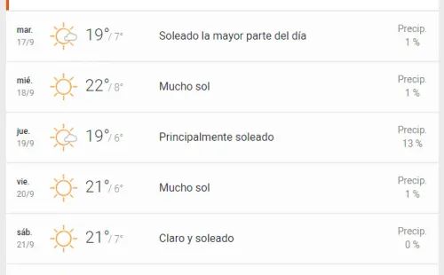 De acuerdo a AccuWeather, Santiago no tendrá lluvia durante los días de Fiestas Patrias. Es más, las temperaturas oscilarán entre los 19° a 21° como máximas, y entre 6° a 8° las mínimas, con cielos despejados y algunas nubes.