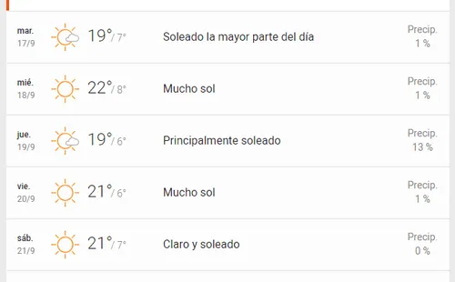 Finalmente, para el viernes 20 de septiembre,la Dirección Meteorológica de Chile señala que”la costa del norte grande variará de nublado a despejado, mientras que el interior variará de nubosidad parcial alta a despejado. El norte chico estará despejado tanto la costa como el interior. La zona centro variará de nublado a nubosidad parcial, mientras que las zonas sur y austral se mantendrán con abundante nubosidad y chubascos débiles.”