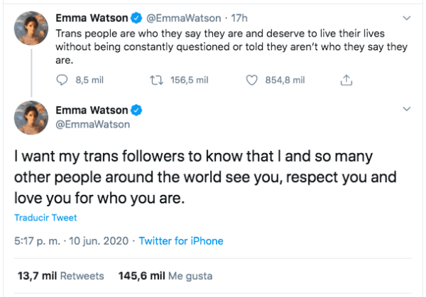 A través de Twitter, Watson estableció su postura en la materia indicando que “las personas trans son lo que ellas determinan ser y merecen vivir sus vidas sin constantes cuestionamientos o que les digan que no son lo que dicen ser”.