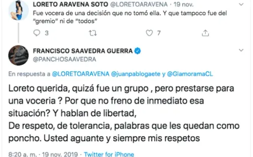 Sin embargo, la mismísima Loreto Aravena irrumpió en la plataforma digital para aclarar lo que había sucedido, respondiéndole a Saavedra desde su cuenta.