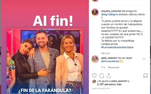 Compartiendo en sus historias de Instagram la publicación de Cooperativa que anunciaba la noticia, la intérprete lanzó un escueto mensaje para celebrar el punto final al programa de farándula: “Al fin!”.