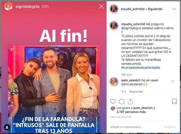 En el texto, que acompañó con una captura de la historia de Alegría, la panelista del espacio de La Red también le cuestionó que “Tú pides justicia social y te alegras cuando un montón de trabajadores con familias se quedan cesante?????? En qué quedamos,,,, no son ustedes los que gritan NO A LA CESANTÍA?????”