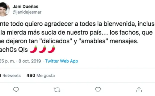 En la previa a su fallida presentación en Viña 2018, Jani Dueñas cerró su cuenta en Twitter. Desde ese entonces, pocas veces reapareció en la red social del pajarito, hasta que durante la jornada de este martes, dos mensajes desataron el apoyo y la ira, por igual, en torno al perfil de la comediante.