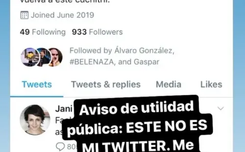 Ante tal panorama, la misma Jani Dueñas salió al paso de las especulaciones y ataques, pero por medio de su cuenta en Instagram, donde especificó que le habían robado el nombre de usuario en Twitter y quien había publicado los mensajes que reactivaron el timeline no había sido ella.