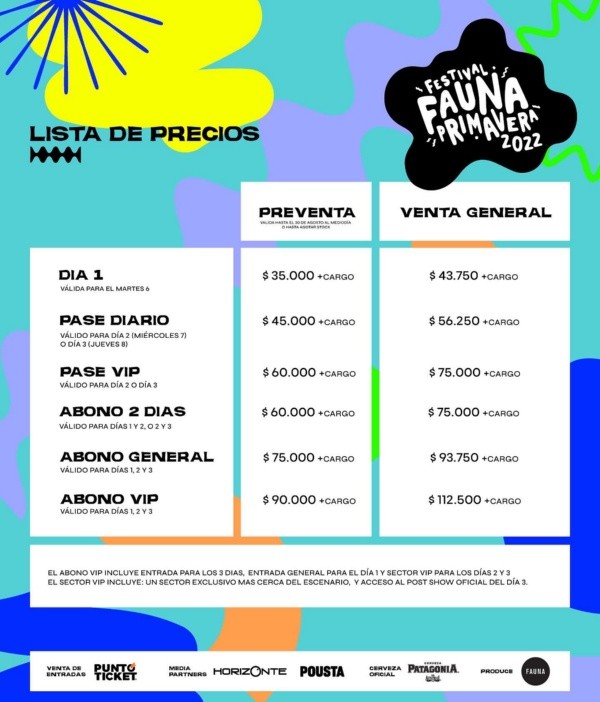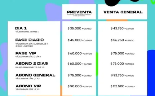 El festival ofrecerá diferentes promociones de entradas que irán desde el pase diario con un valor de $35.000 hasta el abono vip, que incluye los tres días,porun precio de $90.000 más cargo por servicio.