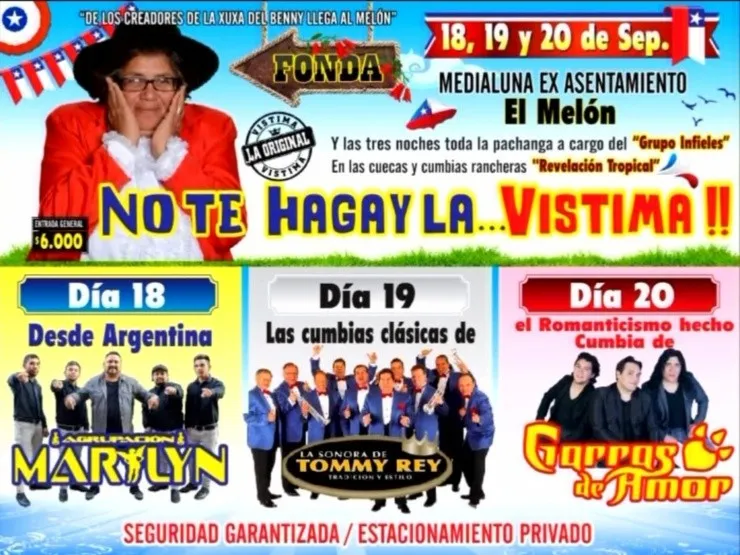 Elizabeth Ogaz, quien fuera conocida por el viral de “La Vístima”, dio el puntapié inicial a la fonda“No te hagai la vístima”, en la Hacienda El Melónen la medialuna de Nogales, región de Valparaíso, a $6.000 la entrada general. Desde el miércoles 18 de septiembre al viernes 20 de septiembre, el show estará a cargo de Grupo Infieles y Revelación Tropical. A ellos, se suman Agrupación Marilyn, La Sonora de Tommy Rey y Garras de Amor.