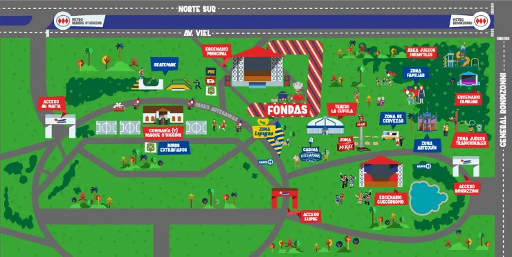Dirección: Parque O´Higgins. La fondas contarán con dos accesos principales: Avda. General Rondizzoni y Avenida Manuel Antonio Matta. Estacionamientos pagados en Club Hípico.