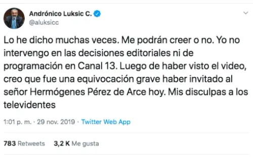 El empresario y dueño de Canal 13 Andrónico Luksic pidió disculpas por el polémico episodio que se vivió la mañana de este viernes en “Bienvenidos”, en la que el abogado Hermógenes Pérez de Arce aseguró que los Derechos Humanos”no son importantes”frente a las pérdidas materiales y posteriormente demostró su negacionismo ante las violaciones sistemáticas de derechos fundamentales que se produjeron durante la dictadura de Pinochet.