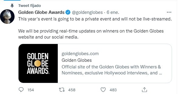 A través de sus redes sociales, la HFPA señaló que “el evento de este año será un evento privado y no se transmitirá en vivo. Proporcionaremos actualizaciones en tiempo real sobre los ganadores en el sitio web de los Globos de Oro y nuestras redes sociales”.