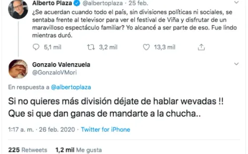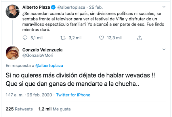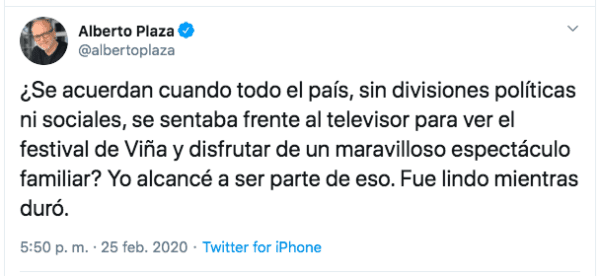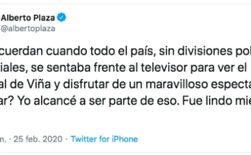 Alberto Plazaha estado atento ala actual versión del Festival de Viña del Mar, donde se han enviado más de un mensaje político sobre el escenario, en referencia al estallido social.